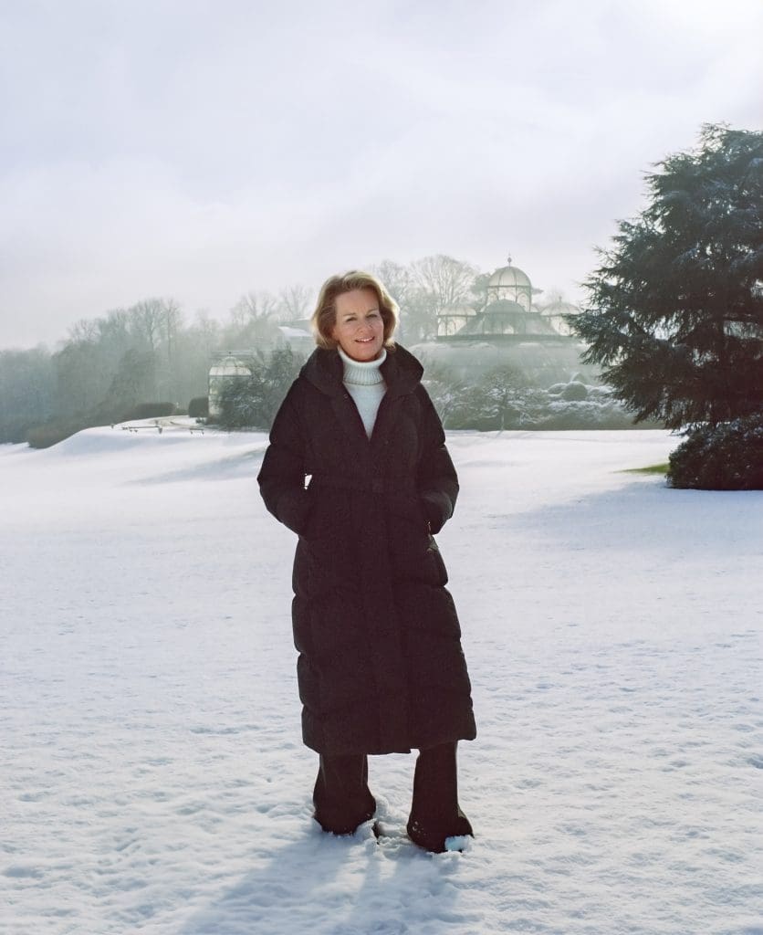 The Queen is seen bundled up in the snow at her and King Philippe’s official residence in Brussels. The famous Royal Greenhouses can be seen in the background.