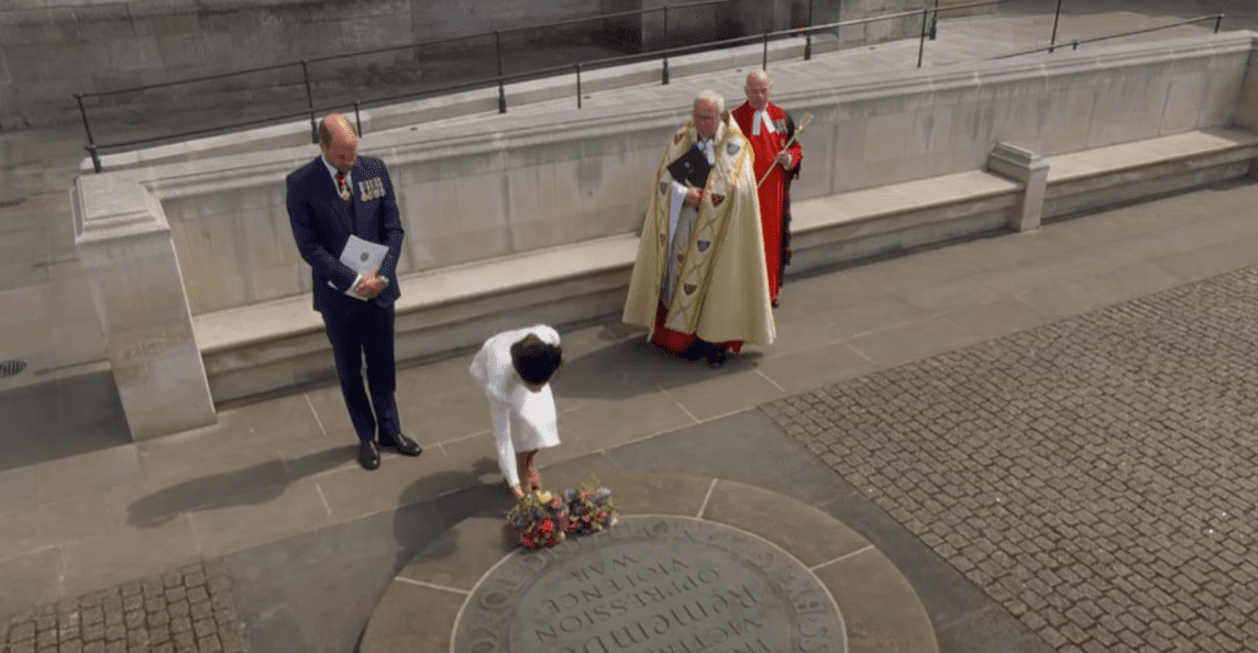 The event ended after Queen Camilla laid flowers at the Innocent Victims’ Memorial, outside the Abbey’s West Door. This was also done by the Princess of Wales, the Duchess of Edinburgh, the Princess Royal and the Duchess of Gloucester.