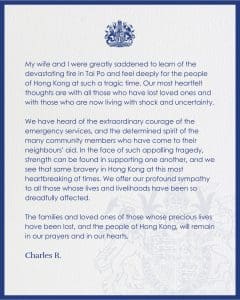The King said, “My wife and I were greatly saddened to learn of the devastating fire in Tai Po and feel deeply for the people of Hong Kong at such a tragic time. Our most heartfelt thoughts are with all who have lost loved ones and with those who are now living with shock and uncertainty.”