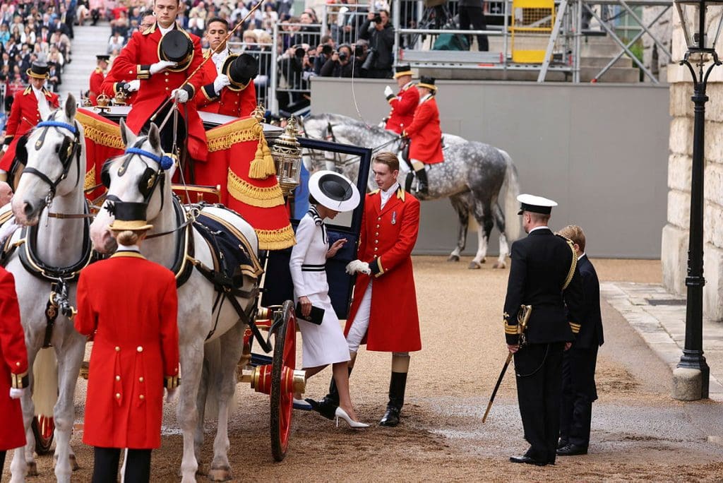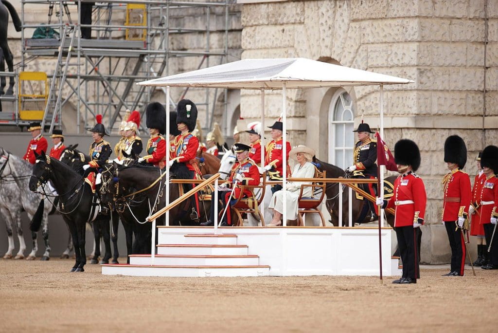 He was joined by his wife, Queen Camilla. On horseback were his son, the Prince of Wales, his sister, the Princess Royal and his brother, the Duke of Edinburgh.
