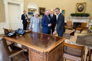 President Barack Obama and then Vice President Joe Biden discuss the Resolute Desk with Charles and Camilla prior to a meeting in 2015. (Official White House Photo by Pete Souza)