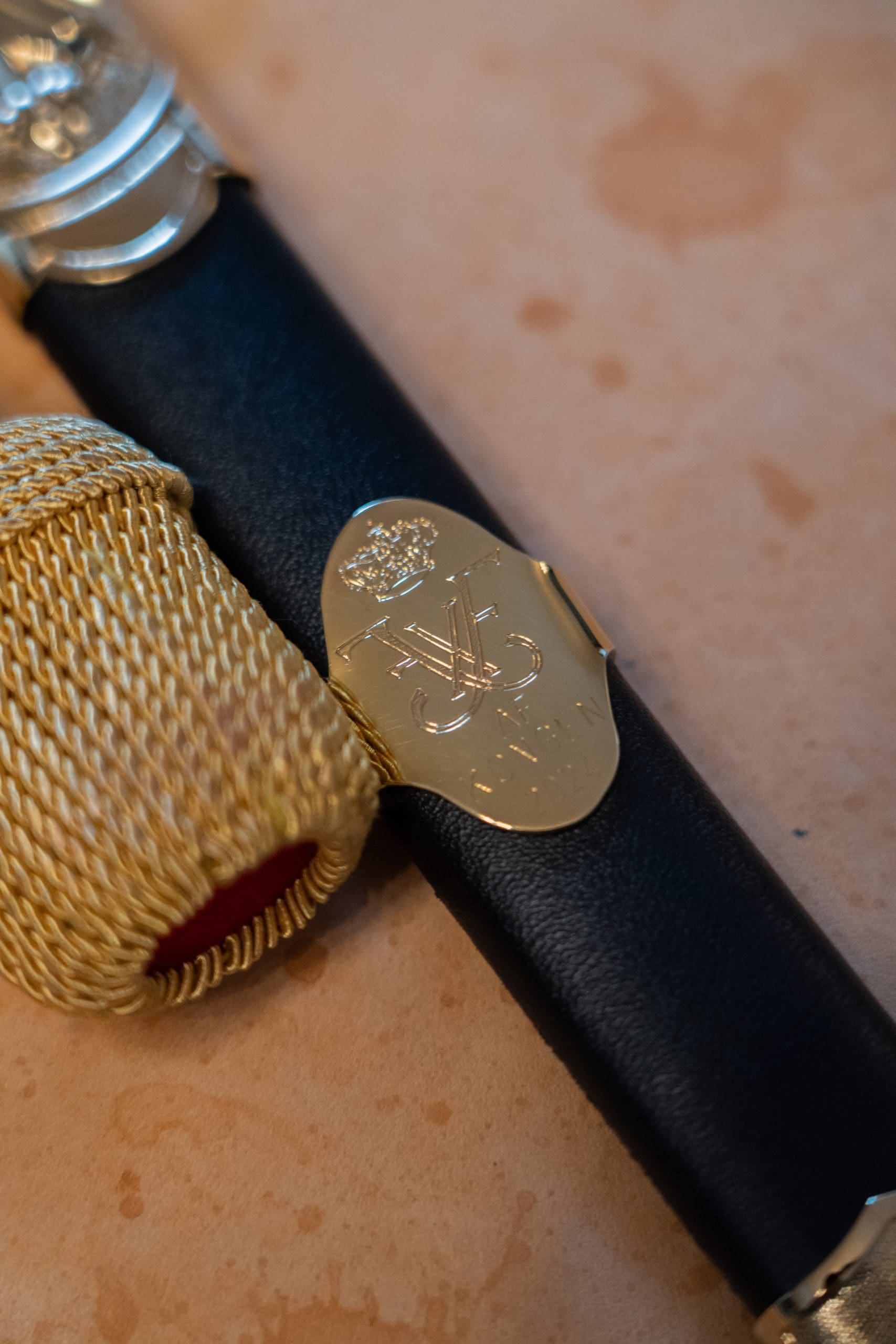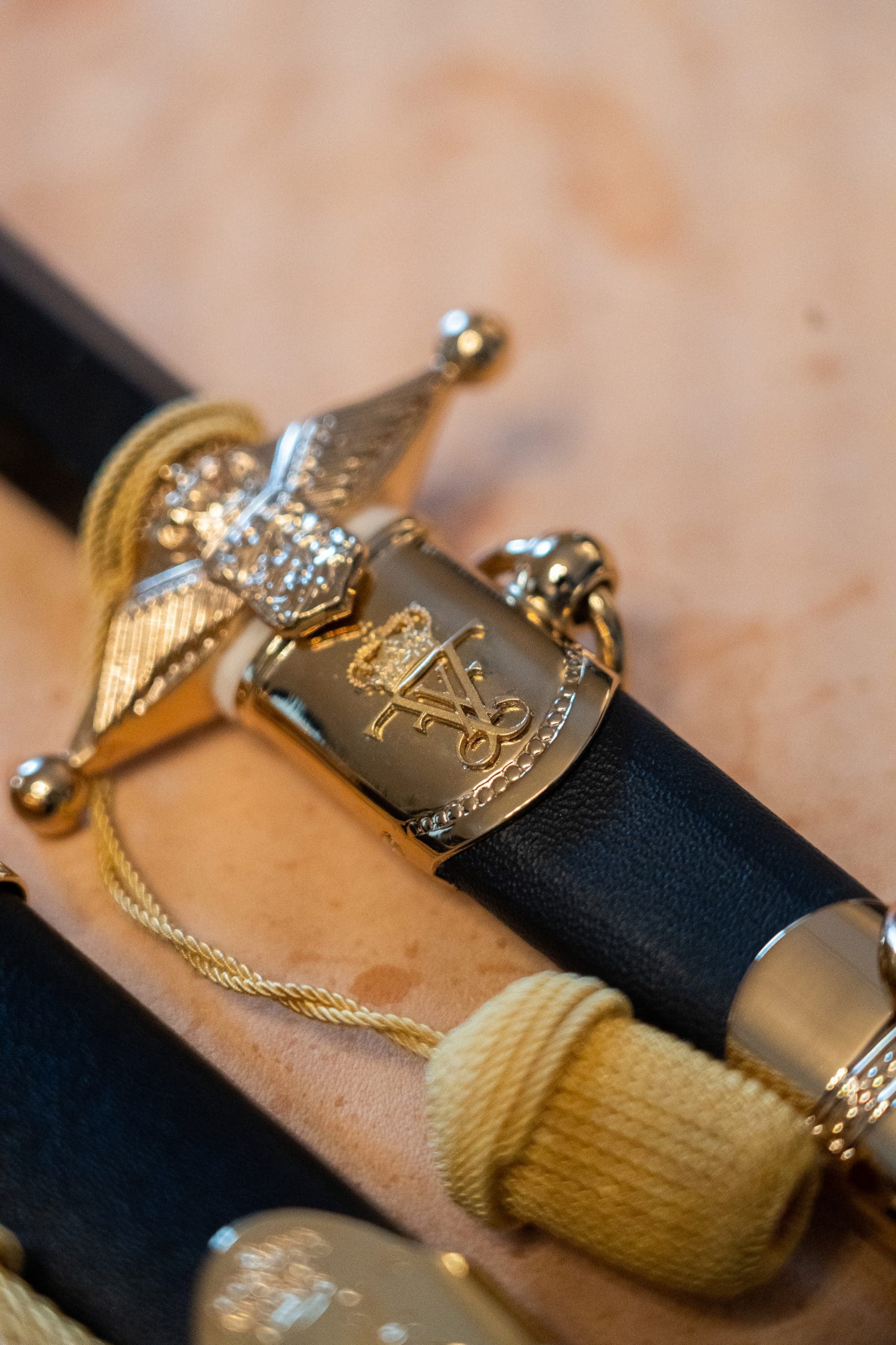 The sabre, presented to cadets in the Army and Navy, has the inscription “By the King” alongside the cadet’s name and year of graduation, while the dagger, presented to cadets in the Air Force, has the cadet’s name, the King’s monogram, and the Air Force emblem.