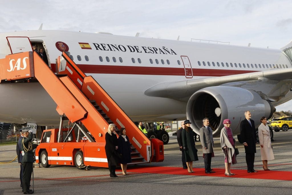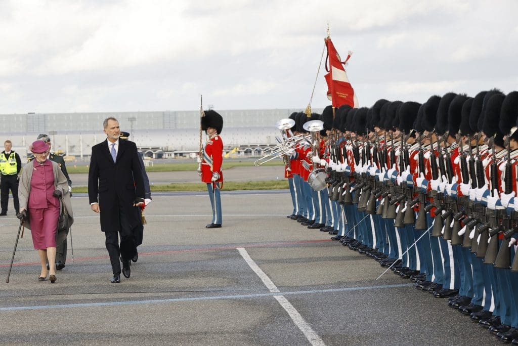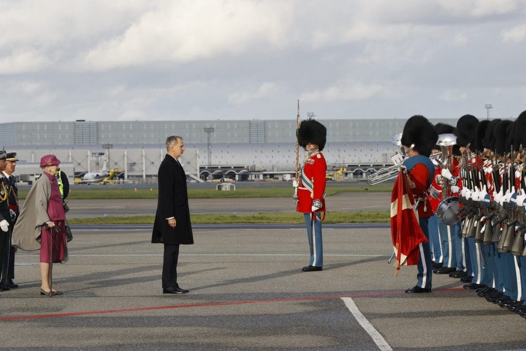 The King and Queen of Spain were received at Copenhagen Airport by Queen Margrethe II of Denmark, Crown Prince Frederik, Crown Princess Mary and Princess Benedikte. After the playing of both national anthems, King Felipe reviewed the Guard of Honour.