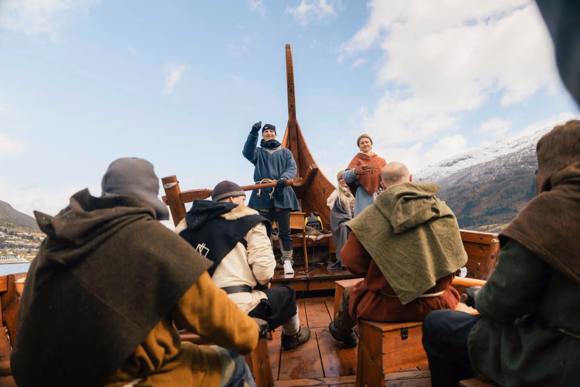 Skipper Rolf Nore and mate Harald Ola Kolseth headed the team of 44 rowers as the Myklebust was rowed to the fjord. The Crown Prince and Prince Sverre Magnus also stood at the helm for a while.