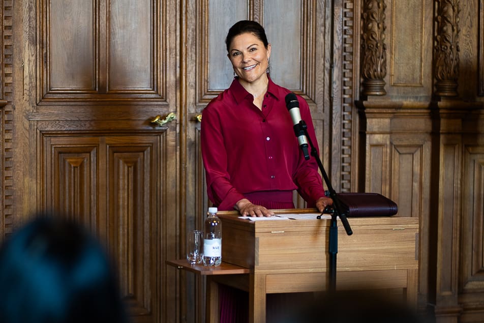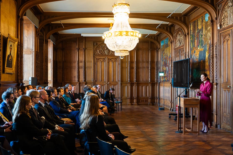 Crown Princess Victoria of Sweden met with participants in the Diplomatic Program, Foreign Service Administrator or Assistant Program at the Ministry for Foreign Affairs (MFA) in the Karl XV Hall at the Royal Palace.
