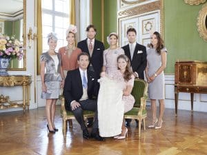 She was christened on her parents’ first wedding anniversary on 8 June 2014 in the Royal Chapel of Drottningholm Palace. Her godparents are her maternal aunt, Crown Princess Victoria; paternal aunt, Tatjana d’Abo; paternal uncle by marriage, Count Ernst Abensperg und Traun; maternal cousin, Patrick Sommrlath; and friends of her parents, Alice Bamford and Louise Gottlieb.