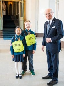 Naomi Riquelme Nagér and Verner Nyberg from Vällingby Scoutkår travelled to the Royal Palace to sell the first pink, blue and yellow flower.